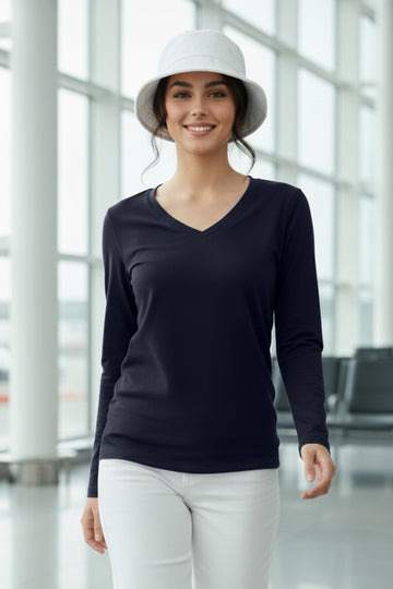 Navy V-Neck Plain Full Sleeve Regular Fit T-Shirt